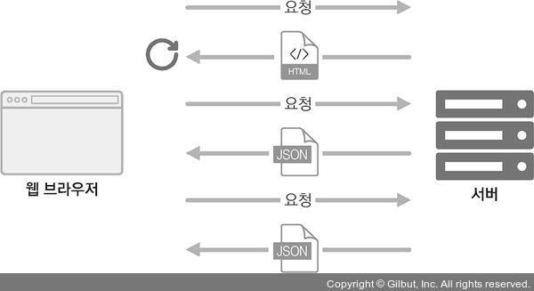 그래서 리액트 같은 라이브러리 혹은 프레임워크를 사용하여 뷰 렌더링을 사용자의 브라우저가 담당하도록 하고, 우선 애플리케이션을 브라우저에 불러와서 실행시킨 후에 사용자와의 인터랙션이 발생하면 필요한 부분만 자바스크립트를 사용하여 업데이트해 줍니다. 만약 새로운 데이터가 필요하다면 서버 API를 호출하여 필요한 데이터만 새로 불러와 애플리케이션에서 사용할 수도 있죠.
