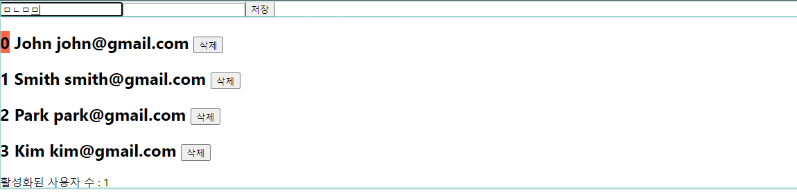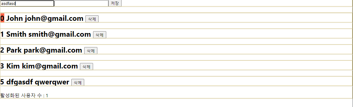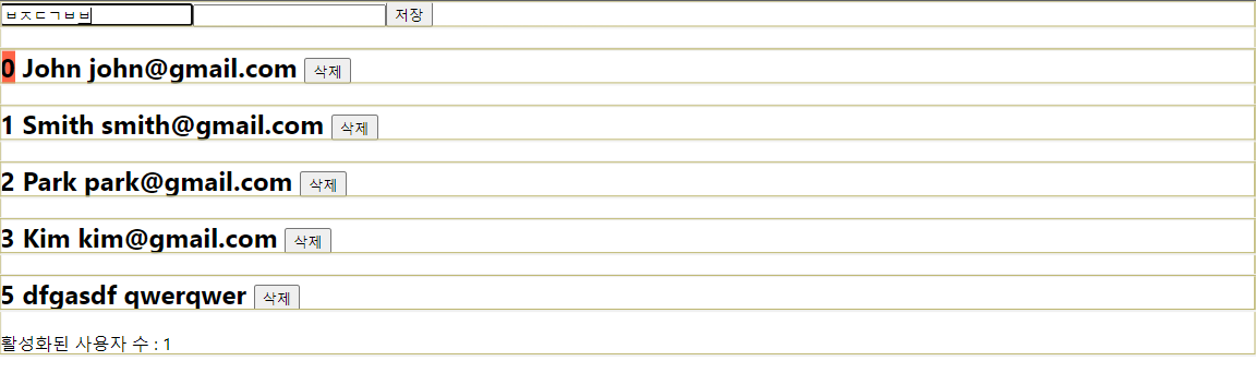 그리고 아래와 같이 Input 박스 안에 텍스트를 넣게 되면 UserList들도 같이 변하게 됨을 확인할 수 있습니다. APP.js 의 CreateUser.js 의 onChange 메소드를 통해 useState를 불러오게 되고, 그에 따라 모든 App.js 컴포넌트들이 리랜더링 되었음을 아래 그림을 통해 확인할 수 있었습니다.